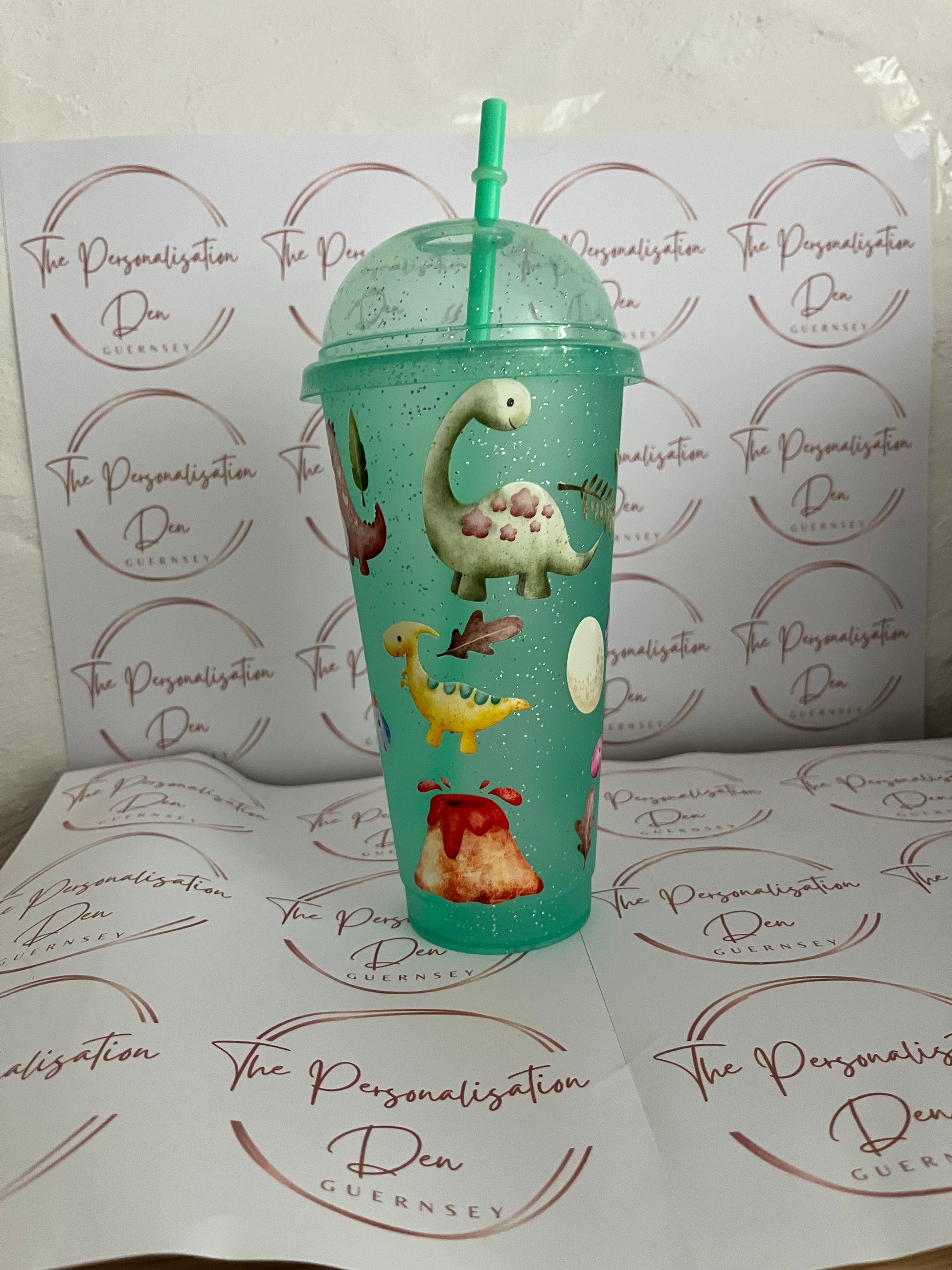 20 oz Green cold cup in a dinosaur theme. This cup is decorated with lots of dinosaurs and relating details such as bones, dinosaur eggs etc